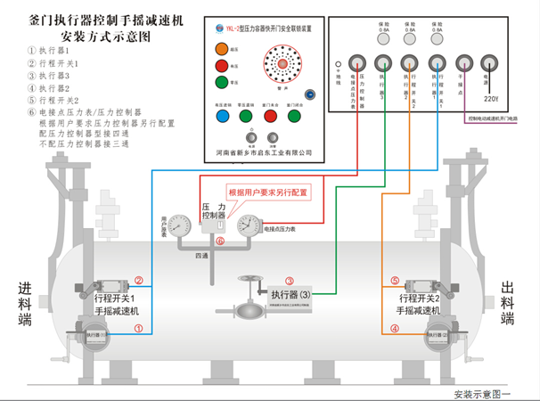 1.將主控箱安裝在便于觀察操作、防水防雨的地方,接通AC220V電源。將三通(壓力控制需配四通)安裝在進(jìn)料端釜門(mén)上部原壓力表處。