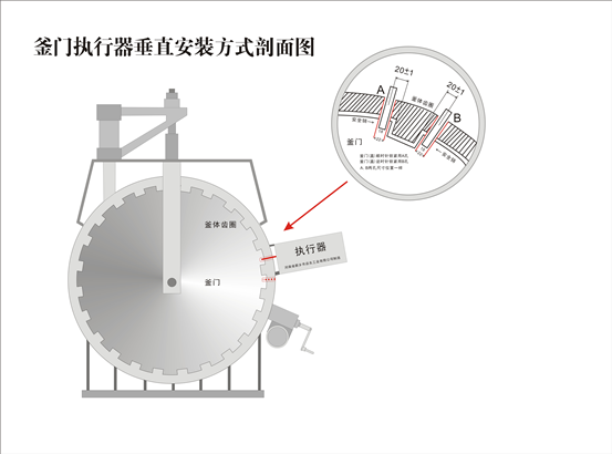 2.3.2.將壓力容器的快開(kāi)門(mén)裝置關(guān)好,使其處于鎖緊閉合到位,確認(rèn)鎖緊及開(kāi)啟方向,按《安全聯(lián)鎖裝置安裝圖》規(guī)定,在外齒圈鎖緊時(shí)的前進(jìn)方向,距殼體內(nèi)齒圈前端20±1mm在齒圈上畫(huà)安全銷(xiāo)孔橫中心線,兩點(diǎn)交叉處為銷(xiāo)孔圓心。